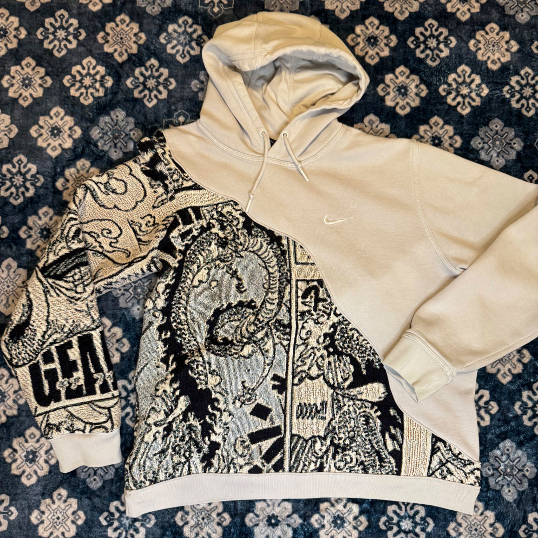 Custom upcycled Nike hoodie with Gear 5 one piece manga tapestry. After cutting and sewing, it now fits like a small.